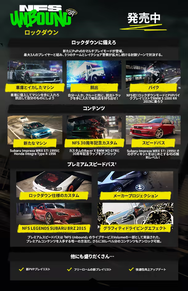 - VOL. 9:ロックダウン — クルーと共に生きるか死ぬかの挑戦が待ち受ける。NFS初となるバイクを使って車庫に侵入してイカしたマシンを手に入れよう。さらに、フルカスタマイズ可能なSubaru Impreza WRX STI '99とHonda Integra Type R '98も登場。